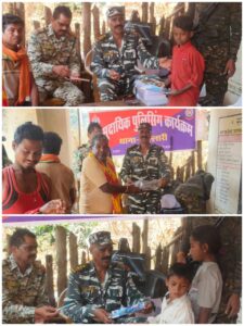 धमतरी पुलिस थाना खल्लारी एवं सीएएफ कैंप प्रभारी द्वारा सामुदायिक पुलिसिंग के तहत नक्सल ग्राम साल्हेभाठ में स्कूली बच्चों को कापी पेन चाकलेट, बिस्किट एवं ग्रामीणों को बांटे कंबल एवं स्वेटर