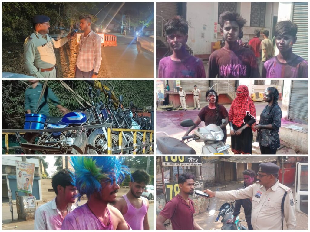 मगरलोड धमतरी – पुलिस अधीक्षक धमतरी श्री आंजनेय वार्ष्णेय के निर्देश पर उप पुलिस अधीक्षक यातायात सुश्री मोनिका मरावी के मार्गदर्शन में होली पर्व के मद्देनजर सड़क सुरक्षा को सुनिश्चित करने हेतु जिला में होलिका दहन एवं होली दिवस पर विशेष वाहन चेकिंग पाईंट लगाया गया जिसमें स्वयं पुलिस अधीक्षक महोदय मौके पर पहुंचकर यातायात नियमों का पालन नही करने वाले वाहन चालकों पर विशेष कार्यवाही करने निर्देशित किया गया था जिसके परिप्रेक्ष्य में विशेषकर रंग गुलाल खेलकर हुड़दंग करते हुए दोपहिया वाहन में तीन सवारी चलने वाले एवं शराब सेवन कर वाहन चलाने वाले वाहन चालकों पर कार्यवाही की गई चेकिंग के दौरान तीन सवारी चलने वाले वाहनों को पकड़कर यातायात सिटी कोतवाली, एवं रूद्री थाना में सुरक्षार्थ रखा गया साथ ही 16 शराबी वाहन चालकों का प्रकरण तैयार कर माननीय न्यायालय पेश किया गया जिसमें से 13 वाहन चालकों से 1,30,000/- रूपये अर्थदण्ड से दण्डित किया गया। थानों में सुरक्षार्थ रखे वाहनों को होली पर्व के उपरांत सभी वाहन चालकों को दोपहिया वाहन में तीन सवारी, बिना हेलमेट, बिना लायसेंस के नही चलने समझाईश देकर छोड़ा गया।
