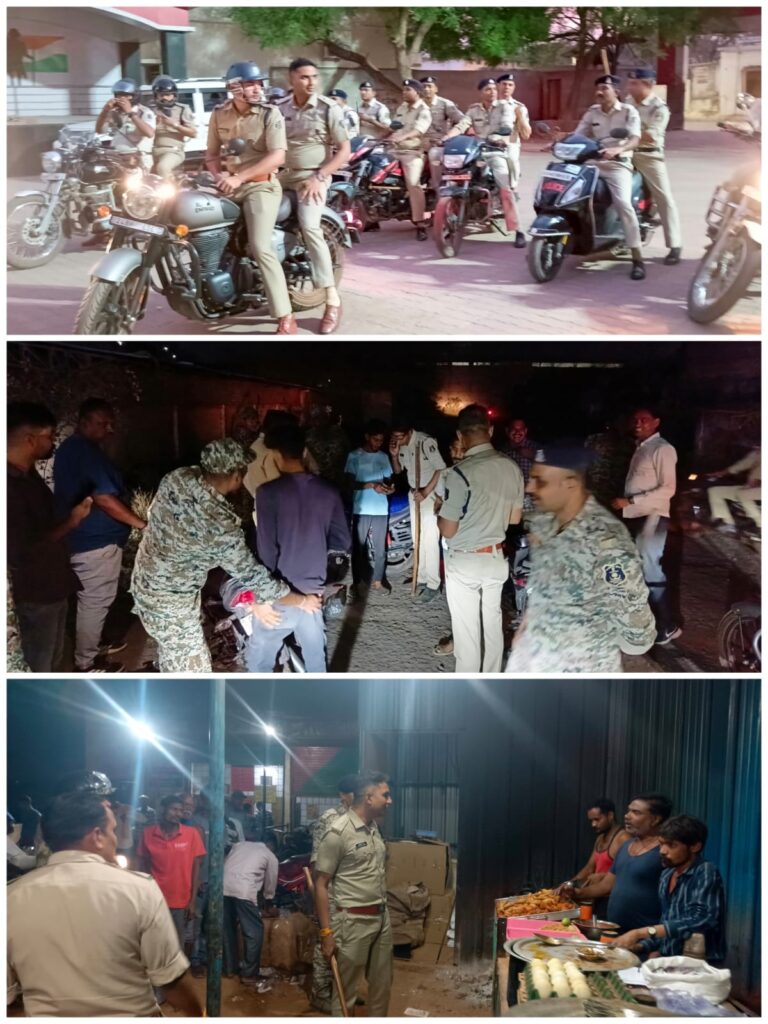 अलग-अलग 06 टीम बनाकर चीता स्क्वॉड एवं क्यूआरटी टीम सहित सभी पुलिस अधिकारी- कर्मचारियों द्वारा मकई चौक,गोलबाजार , कचहरीचौक, सदर बाजार,होते हुए विन्ध्यवासिनी मंदिर सहित सूनसान एवं भीड़ भाड़ जगहों पर बाईक पेट्रोलिंग किया गया। अनावश्यक घुमने वाले असामाजिक तत्वों को धमतरी पुलिस द्वारा पूछताछ करेगी एवं भीड़-भाड़ वाले स्थान, सार्वजनिक स्थान,आम स्थान, सूनसान स्थान में जमावड़ा लगाकर नशा करने वालों, गुटबाजी करने वालों, संदिग्ध व्यक्तियों,असमाजिक तत्वों, संदिग्ध व्यक्तियों के वाहनों एवं वाहनों की डिक्की सहित धारदार हथियार रखकर घुमने वालों की चेकिंग कर सख्त कार्यवाही किये जाने के निर्देश दिये गए।