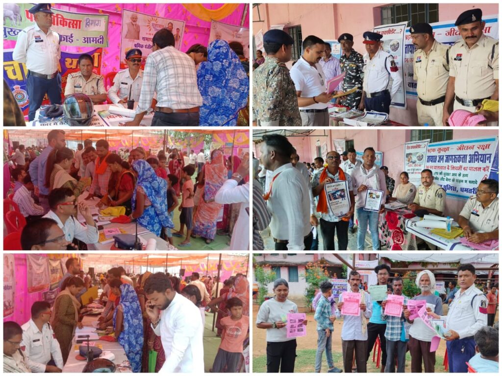 धमतरी/मगरलोड – धमतरी पुलिस,यातायात स्टॉफ द्वारा आये दिन हो रहे दुर्घटना को देखते हुए लगातार सुशासन त्यौहार में आये लोगों को जागरूक करते हुए,सड़क सुरक्षा को लेकर निरंतर कार्य किया जा रहा है। जिसके अंतर्गत जिला प्रशासन द्वारा आज दिनांक 23.05.25 को ग्राम सिहावा एवं आमदी में आयोजित समाधान शिविर में यातायात नियमों के प्रति जन-जागरूकता बढ़ाने के उद्देश्य से यातायात का स्टॉल लगाकर शिविर में आये लोगों को सड़क सुरक्षा, यातायात संकेतों की पहचना, हेलमेट एवं सीट बेल्ट के उपयोग और यातायात नियमों के उल्लंघन पर जुर्माना की जानकारी दी गई।