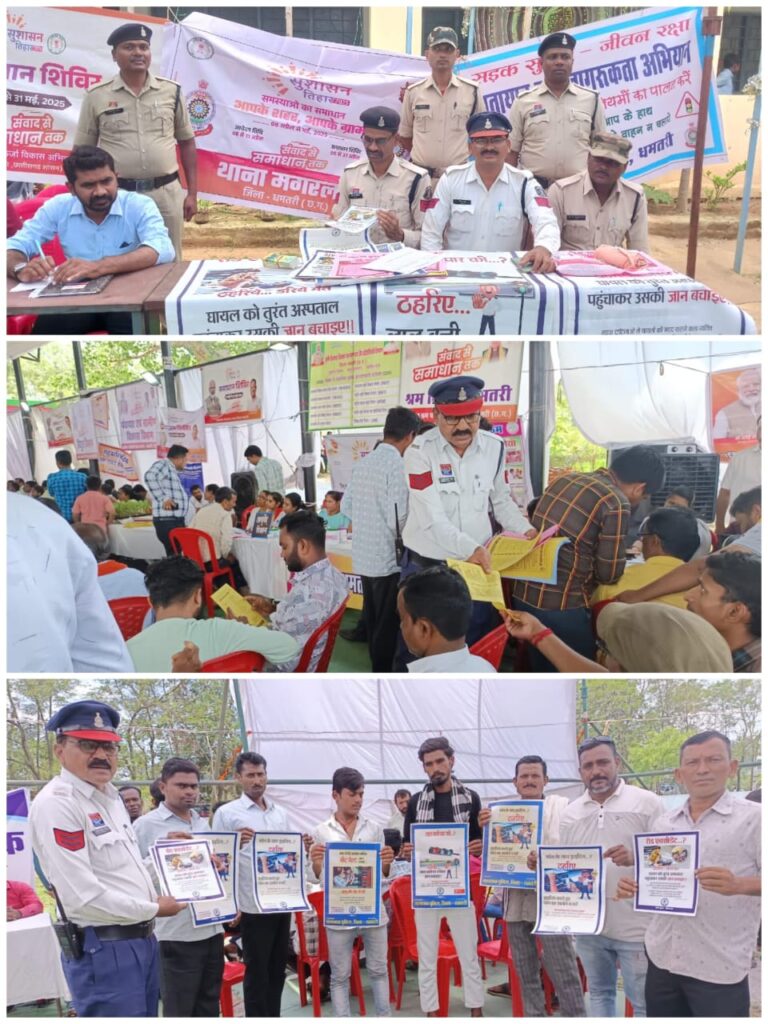 धमतरी पुलिस यातायात द्वारा समाधान शिविरों के माध्यम से लोगों को यातायात नियमों के बारे में बताते हुए,पंप्लेट बांटकर किया जा रहा है यातायात नियमों के प्रति जागरूक