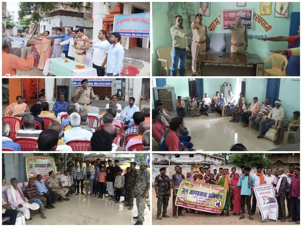 इसी तरह थाना नगरी क्षेत्र में भी जागरूकता कार्यक्रम भी नशा मुक्ति पखवाड़ा के अंतर्गत जनजागरूकता कार्यक्रम आयोजित किया गया, जिसमें ग्रामीणों को नशे की बुराइयों के प्रति जागरूक करते हुए नशामुक्त जीवन जीने के लिए प्रेरित किया गया।थाना प्रभारी द्वारा बताया गया कि पुलिस की यह पहल केवल कानूनी नहीं, बल्कि सामाजिक उत्तरदायित्व भी है, जिसे जनभागीदारी से ही सफल बनाया जा सकता है।धमतरी पुलिस द्वारा सभी थाना क्षेत्रों में चलाया जा रहा यह जनजागरूकता अभियान समाज को नशे के चंगुल से मुक्त कराने और एक स्वस्थ, सशक्त एवं जागरूक समुदाय के निर्माण की दिशा में एक सशक्त पहल है।