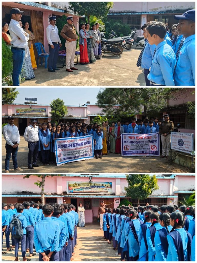 एसपी धमतरी के निर्देश पर यातायात पुलिस द्वारा चलाया जागरूकता अभियान – शासकीय उच्च. माध्य. विद्यालय भटगांव में छात्रों को यातायात नियमों एवं नशामुक्ति की दी गई जानकारी