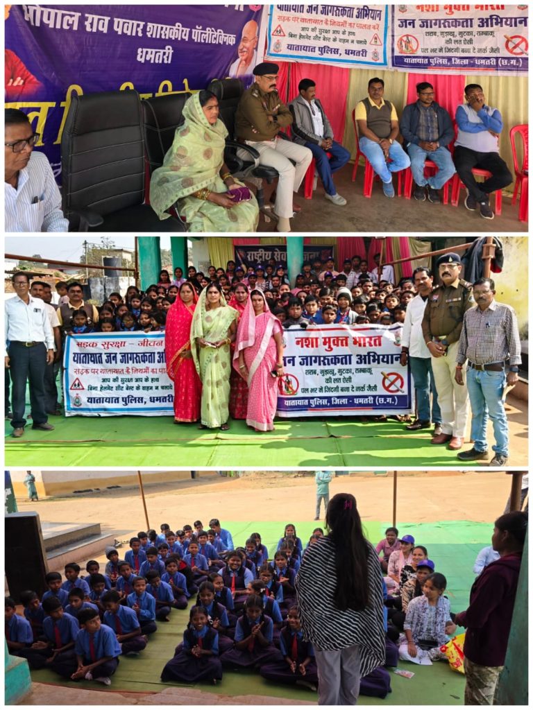 धमतरी/मगरलोड – एसपी धमतरी के निर्देशन में धमतरी पुलिस यातायात शाखा द्वारा सड़क सुरक्षा एवं नशा मुक्त समाज निर्माण के लिए जिले में निरंतर रूप से जागरूकता कार्यक्रम संचालित किए जा रहे हैं।