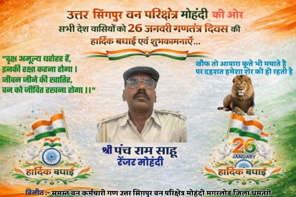धमतरी/मगरलोड –उत्तर सिंगपुर वन परिक्षेत्र मोहदी की ओर से समस्त क्षेत्र वासियों को 26 जनवरी गणतंत्र दिवस की हार्दिक शुभकामनाएं… इस अवसर पर वन अधिकारी रेंजर मोहंदी पंच राम साहू एवं कर्मचारियों ने कहा कि वनों की रक्षा एवं वन्य जीव की सुख सुविधा का भी ध्यान हम सभी लोगों को करना चाहिए हमारा नैतिक कर्तव्य बनता है की प्रकृति के साथ कभी खिलवाड़ ना करें पौधे लगाए और वन्य जीवो के साथ कभी भी घटना का प्रयास ना करें प्रकृति की रक्षा करना हम सब का कर्तव्य है और यही जीवन का अमूल्य धरोहर है
