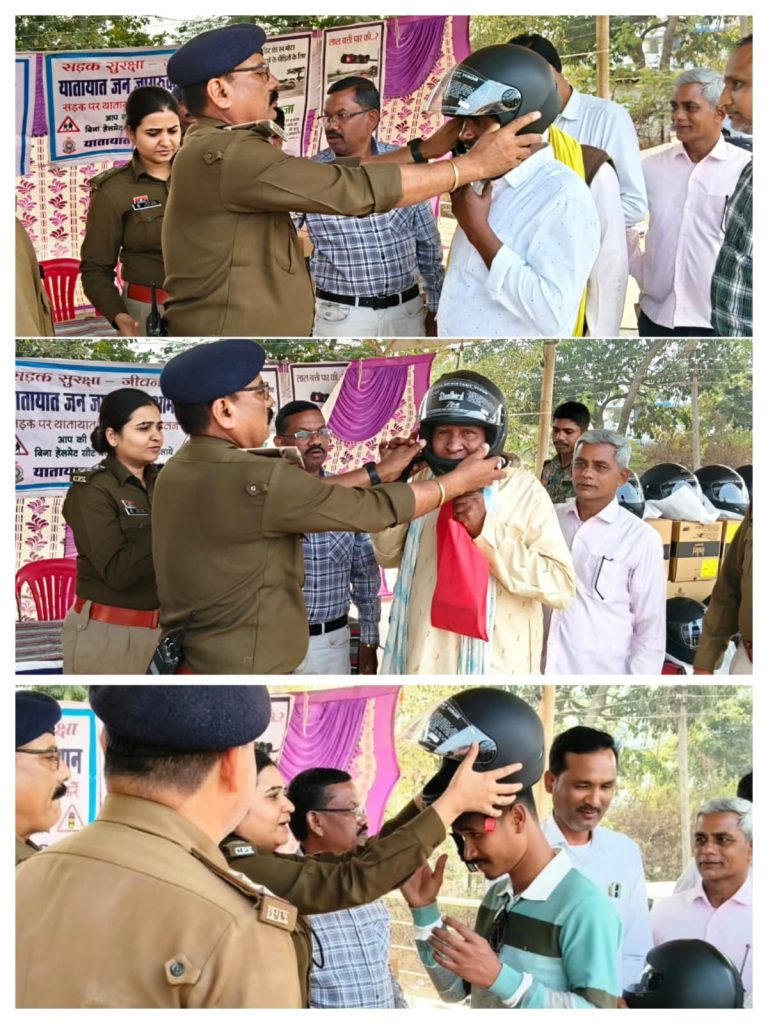 राष्ट्रीय सड़क सुरक्षा माह मगरलोड में जरूरतमंद दोपहिया वाहन चालकों को धमतरी पुलिस ने किया निःशुल्क हेलमेट वितरण