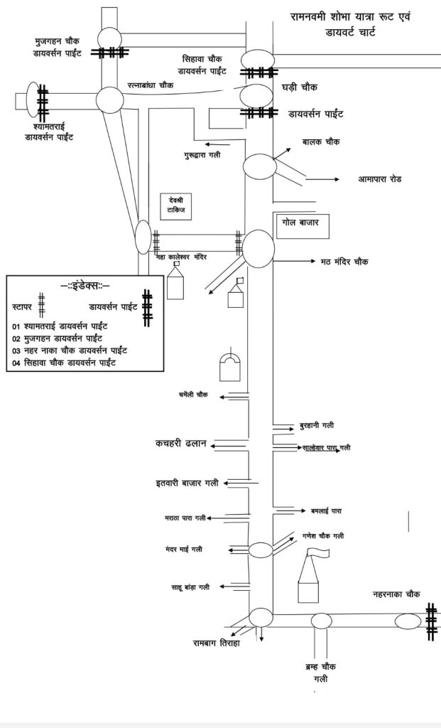 शाम 4 बजे से शोभायात्रा के समाप्ति तक घडी चौक से विंध्यवासिनी मंदिर तक सभी प्रकार की छोटी बड़ी वाहनें सदर मार्ग में पूर्ण प्रतिबंध रहेगा। गंतव्य तक पहुंचने के लिए सदर मार्ग से लगे सहायक मार्गों से आवागमन किया जावेगा।शोभायात्रा के दौरान सादी वर्दी में तैनात जवानों एवं सीसीटीवी कैमरा के माध्यम से संदिग्ध व्यक्तियों एवं संदिग्ध गतिविधियों पर निगाह रखी जावेगी।
